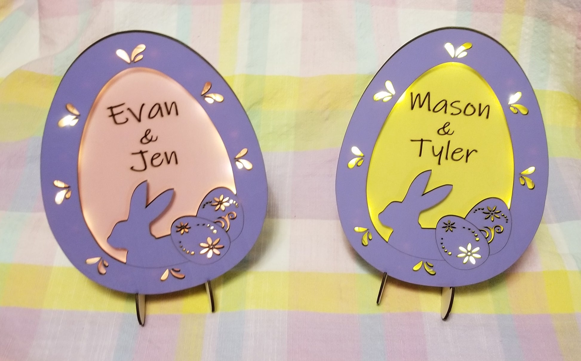 Decorative egg with collapsible stand. Egg and stand are made of 1/16" Natural Basswood Plywood. The top layer of the egg is laser cut with a decorative pattern around the edge and a rabbit silhouette behind two eggs at the bottom. The inside bottom layer of the egg is engraved with the name or names you choose. The egg has LED lights that can be turned on for a festive look. Lights are powered by batteries that can be replaced by removing the cover on the back of the egg.