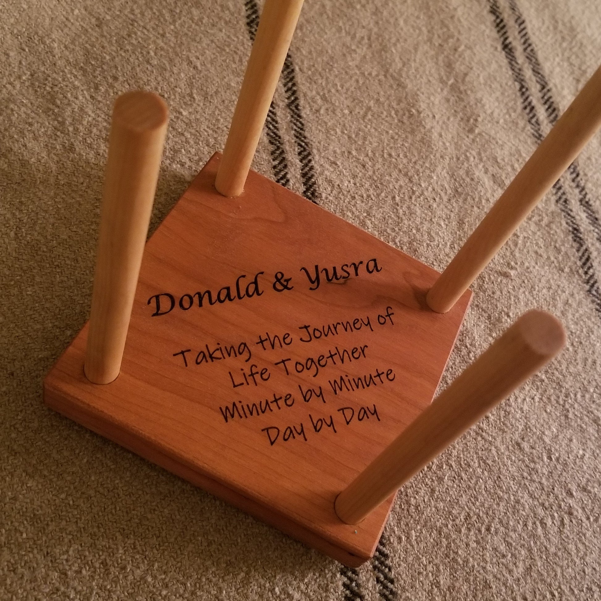 Set of 4 coasters made from cherry, maple, walnut or poplar. Coasters are approximately 4" x 4" x 3/4" and laser engraved with a monogram letter and name. The monogram letter will appear in the circle portion of the design using the font as shown. The name will appear between the lines of the design in the font shown in all capital letters. The holder is also 4" x 4" and custom engraved with name, or names, and a short phrase. The set is coated with food grade mineral oil. You should reapply mineral oil or a board butter to maintain the condition of the wood.